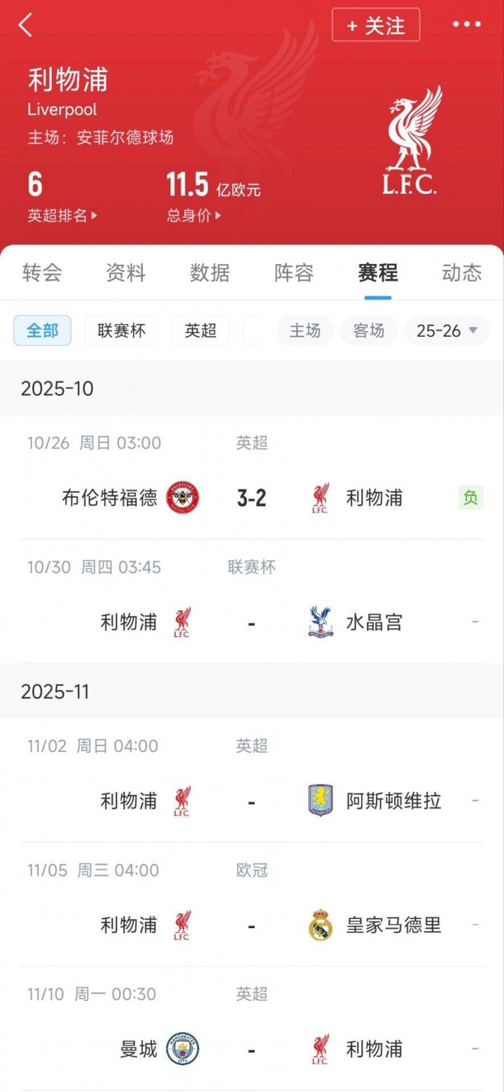 10月26日讯 英超第9轮利物浦2-3不敌布伦特福德,遭遇英超四连败。
