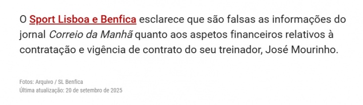 但本菲卡发布声明表示:本菲卡俱乐部澄清,《晨邮报》(Correio da Manhã)中关于指导教练员穆里尼奥的签约及合约有效期相关财务信息均为不实信息。