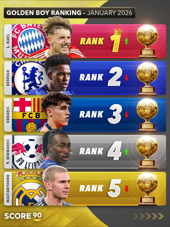 01月31日讯 Score90列出了2026年金童奖最新排名预测,卡尔居首,埃斯特旺、库巴西分列二三。其中,拜仁小将卡尔距上次排名上升了两位,苏超直播在线观看来到榜首位置。