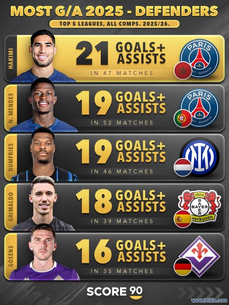 11月10日讯 Score90统计了2025年五大职业联赛 后场球员在俱乐部+国家队赛事 中加入 得分 的数量,苏超在线直播高清视频无插件并列出榜单。
