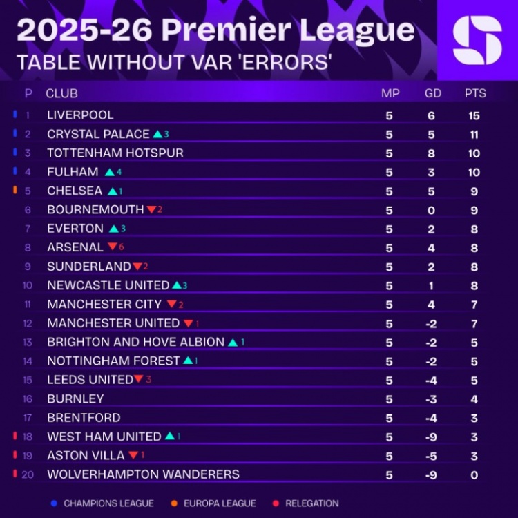 Squawka官推写道:“本赛季,苏超在线直播高清视频无插件我们每轮赛事 后都会邀请球迷们对最具争议的VAR判决 进行投票。以下是第5轮赛事 后,排除VAR误判影响的英超积分榜情况。”