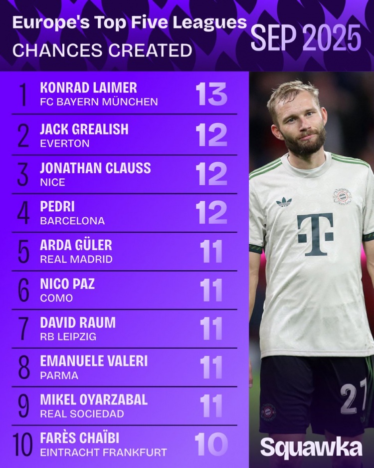 10月1日讯 Squawka统计了欧洲五大职业联赛 球员在9月份的创造机会次数榜单,苏超直播拜仁后场球员莱默尔位列第一。