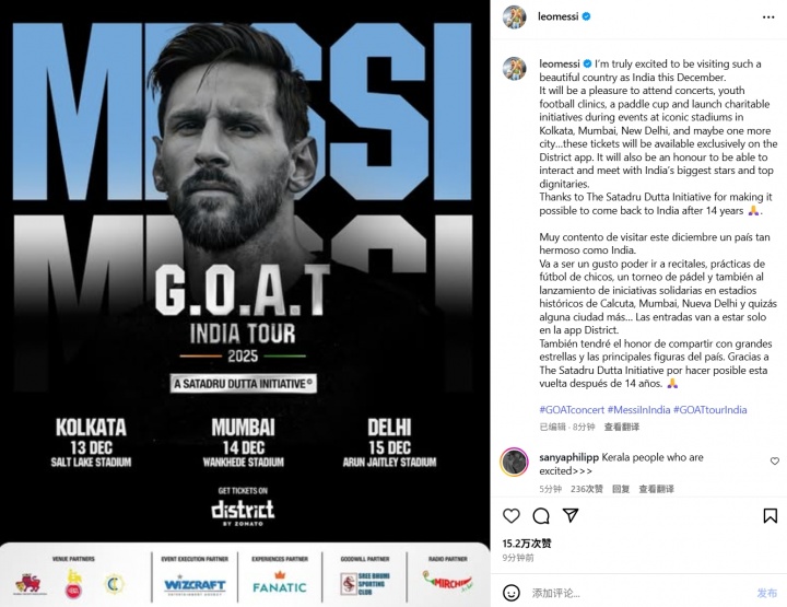 10月02日讯 梅西发布社媒,官宣自己将在今年十二月开启印度行,参加多项活动,并与明星与高层政要互动沟通 。