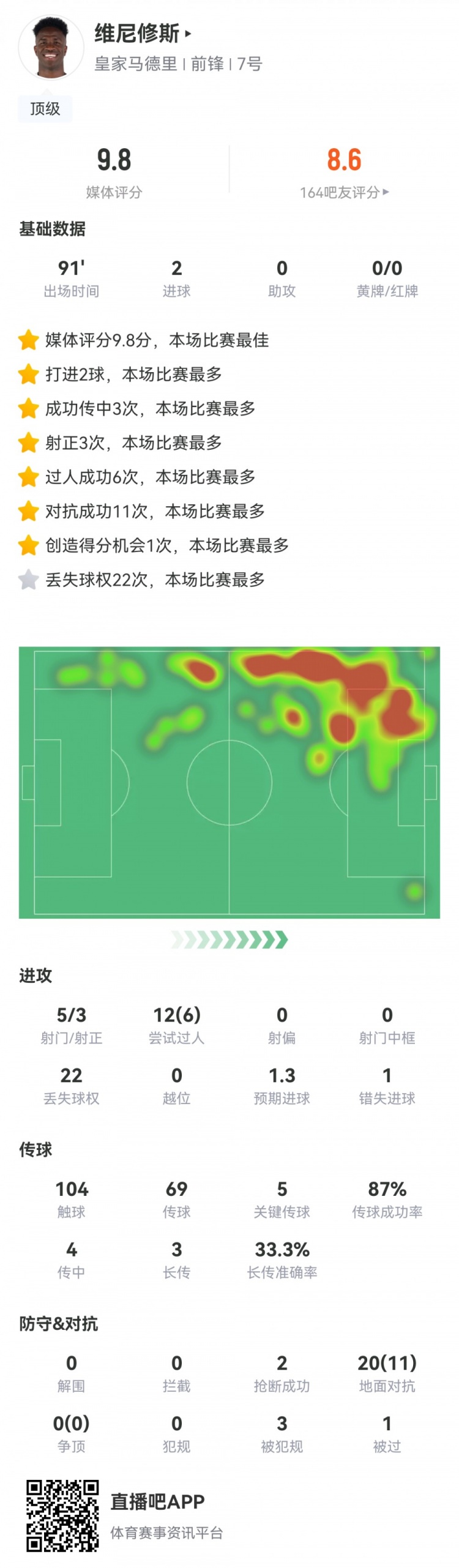 10月5日讯 本轮西甲,皇马3-1黄潜。此役维尼修斯杆位打满全场,苏超直播在线观看球员全场重积分 据如下↓