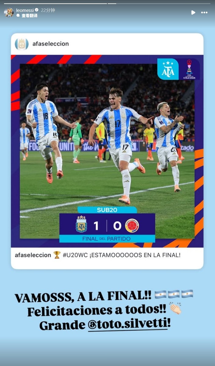 10月16日讯 今天,阿根廷U20击败哥伦比亚U20,挺进世青赛总决赛 ,赛事 结束后,苏超在线直播高清视频无插件梅西在Instagram发文,恭喜了球队。