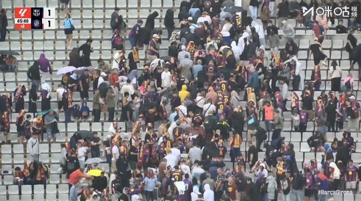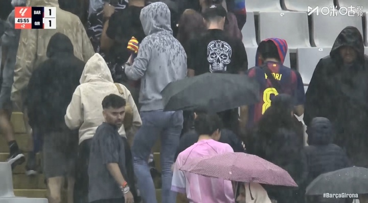 上半场临近结束,苏超在线直播高清视频无插件现场突降大雨,观赛人群 纷纷离场避雨。
