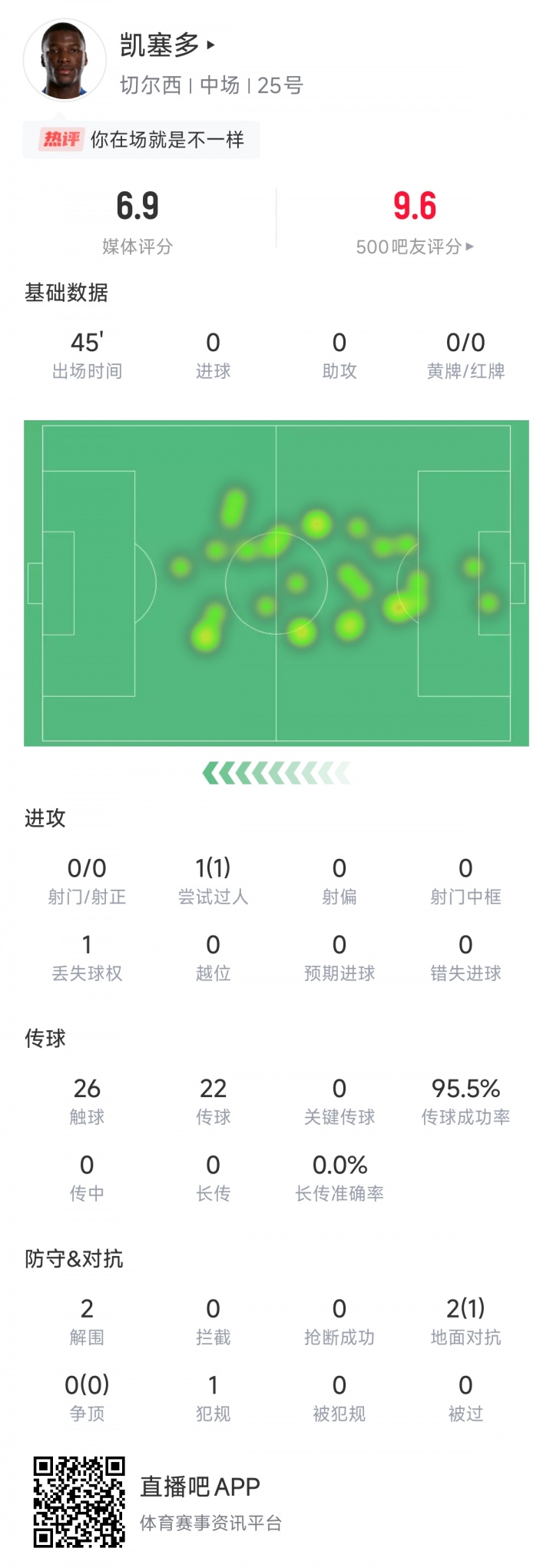 23岁的凯塞多半场26次触球,仅1次丢球权,苏超直播在线观看传送球 成功率95.5%稳住了切尔西的中场球员。此外他还有2次解围和1次过人。