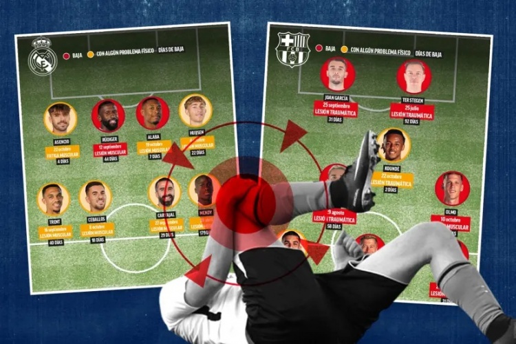 10月25日讯 据《马卡报》统计,皇马和巴萨两队共计有多达16名球员受到不同程度的身体问题困扰。其中,皇马的吕迪格和阿拉巴,以及巴萨的特尔施特根、加维、莱万、奥尔莫、拉菲尼亚和霍安-加西亚共八人已确定缺席。