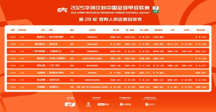11月1日讯 今天下午14:30,2025赛季中甲职业联赛 第29轮8场同开,苏超直播在线观看中甲职业联赛 官方公布了执法裁判 名单,其中5场赛事 设有VAR。
