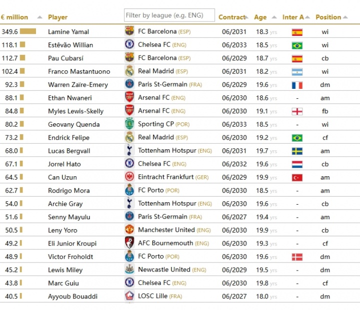 11月05日讯 今日,古代足球 权威统计机构CIES统计了尚未年满20岁但预估转会费最高的球员,其中四位球员的预估转会费超过1亿欧元(含附加条款,且为100%所有权)。亚马尔3.5亿欧,断层领跑 !